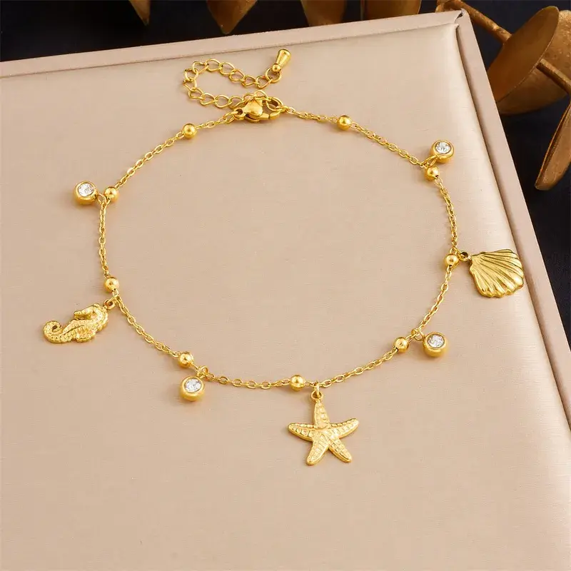 tainless Steel Enkelbandje Zeester & Schelp – Goudkleurig met Bedels