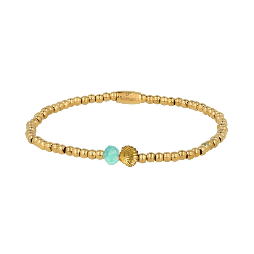 Stijlvolle armband met Amazonite schelp bedel. Gouden kralen stralen elegantie uit. Symbool van rust en balans. Perfect voor dagelijks gebruik.