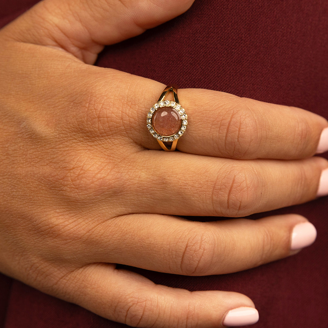 Het warme, roodachtige karakter van de Berry Quartz edelsteen wordt schitterend geaccentueerd door een omlijsting van glinsterende zirkonia steentjes. Dit maakt de ring zowel stijlvol voor dagelijks gebruik als bijzonder voor feestelijke gelegenheden.