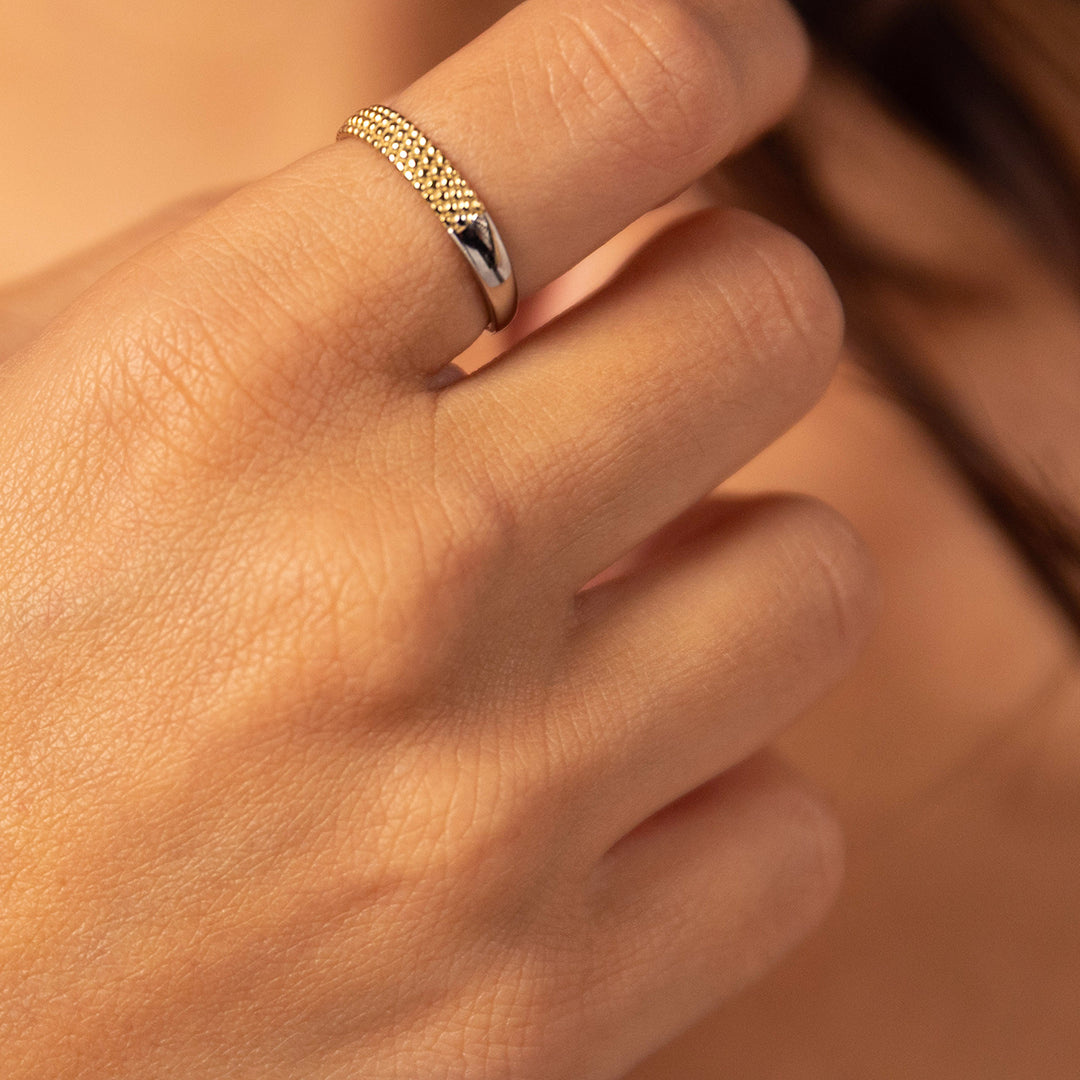Deze fijne bicolor aanschuifring heeft een speels design van goudkleurige bolletjes op een zilverkleurige basis. Subtiel, maar met een opvallend detail dat jouw ring nét dat beetje extra geeft. Gemaakt van stainless steel, dus blijft lang mooi en is bestand tegen dagelijks gebruik. Draag hem los of stapel meerdere ringen voor jouw eigen stijl.