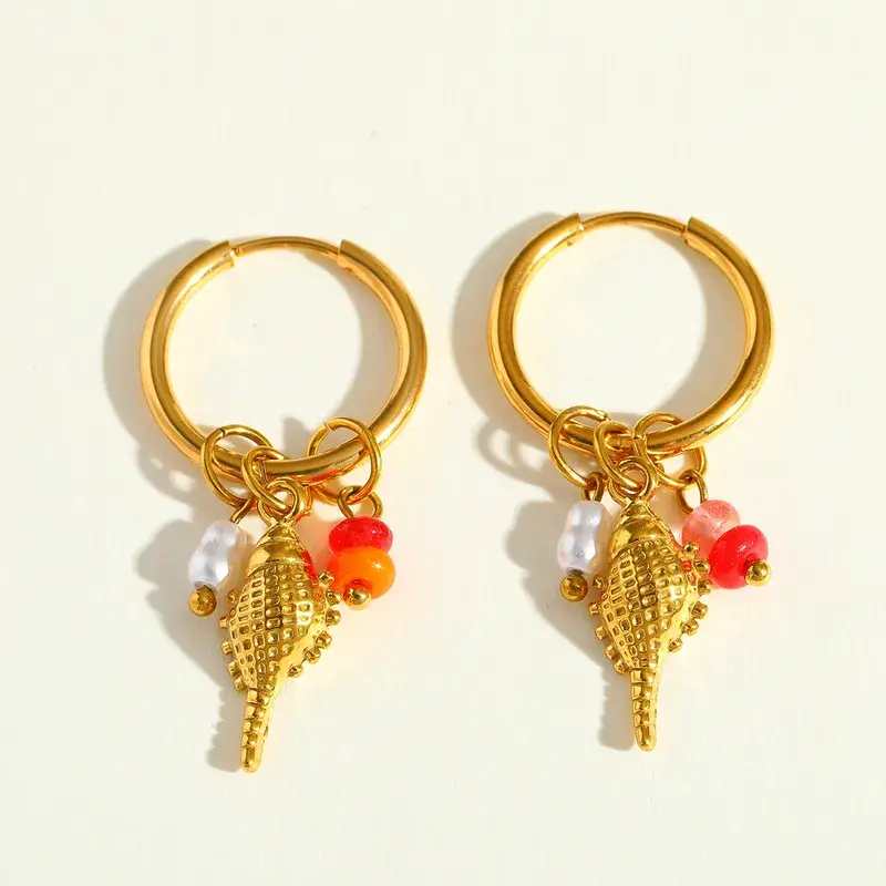 Stainless Steel Oorbellen Schelp Bedel met Kralen – Goudkleurige Hoops