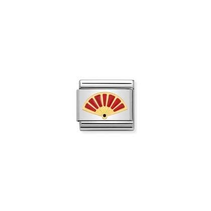 Dit stainless steel linkje van Nomination heeft een waaier als afbeelding in 18k goud en emaille.