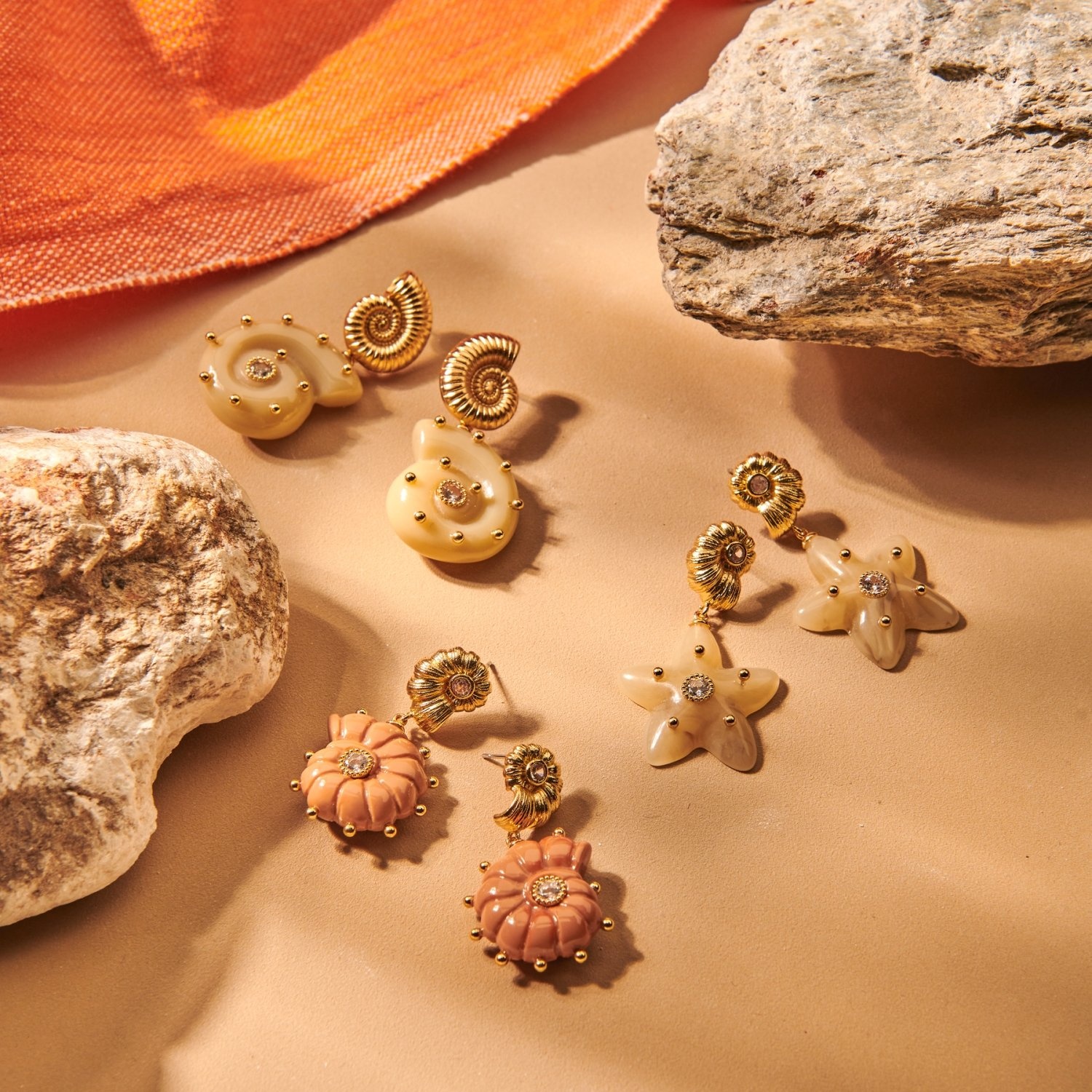 Droom weg naar tropische oorden met deze speelse oorbellen in de vorm van een zeester. De combinatie van parelmoer, goud en sprankelende steentjes maakt elke look magisch!