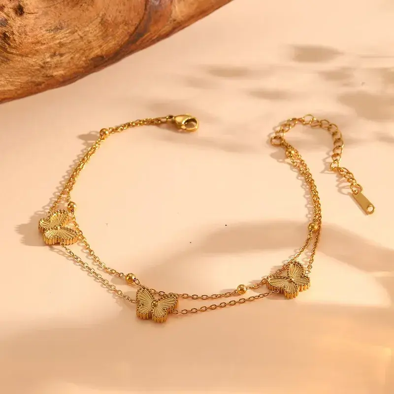 Elegant stainless steel enkelbandje met dubbele ketting en vlinder bedels. Subtiel, vrouwelijk en perfect voor elke zomerse look.