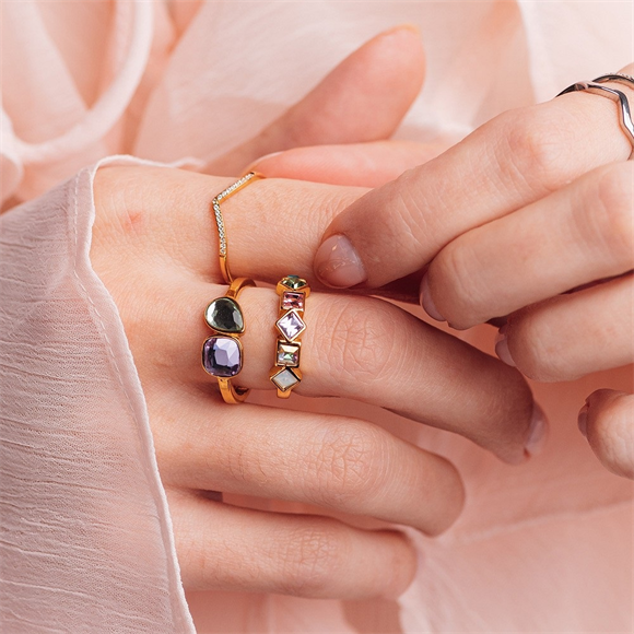 Goudkleurige stainless steel iXXXi Fame los te dragen ring met paarse en groene stenen.