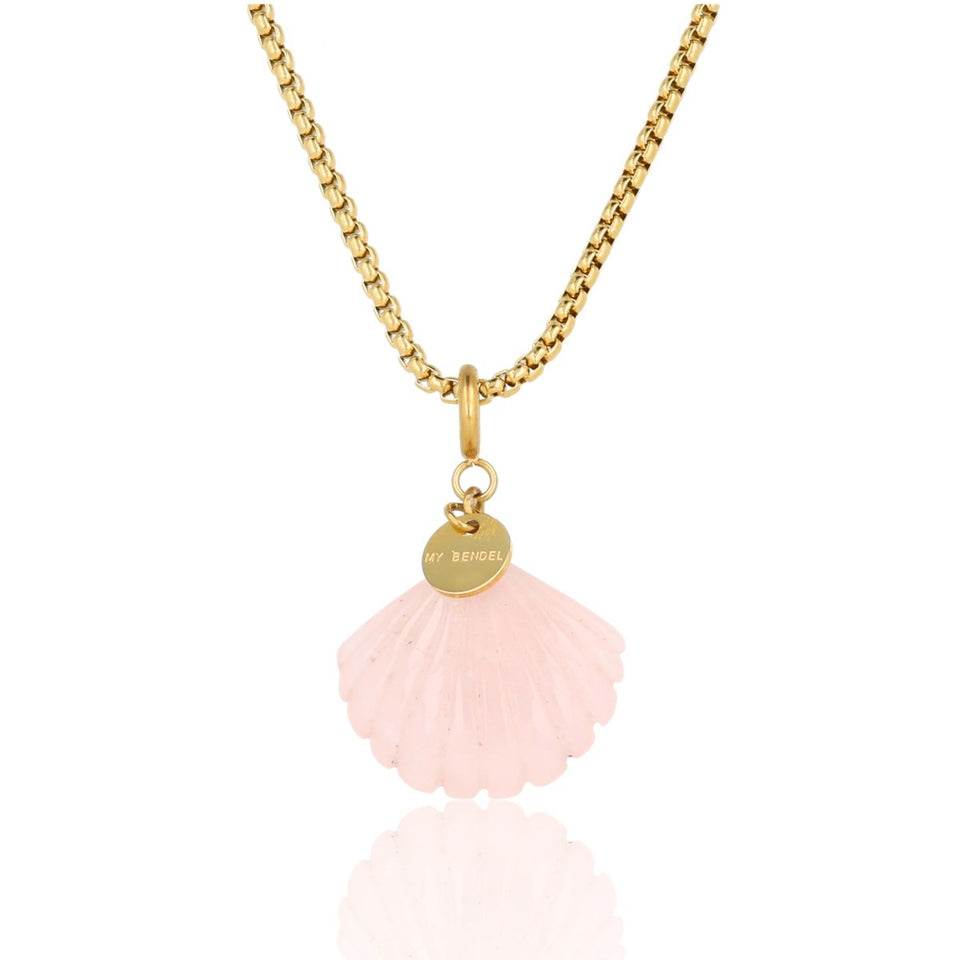Zomerse gouden ketting met delicate Rose Quartz schelp, symbool van liefde en kracht. Voeg tijdloze elegantie toe met My Bendel.