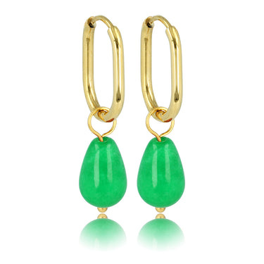 Chic en stijlvol: Gouden ovalen oorbellen met peervormige Chrysoprase hanger op nikkelvrij stainless steel. Voeg luxe toe aan je look - My Bendel.