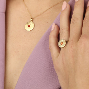 Gouden ring met zonnetje en Carnelian edelsteen: stijlvol, stralend en vol positieve energie. 1 jaar garantie.