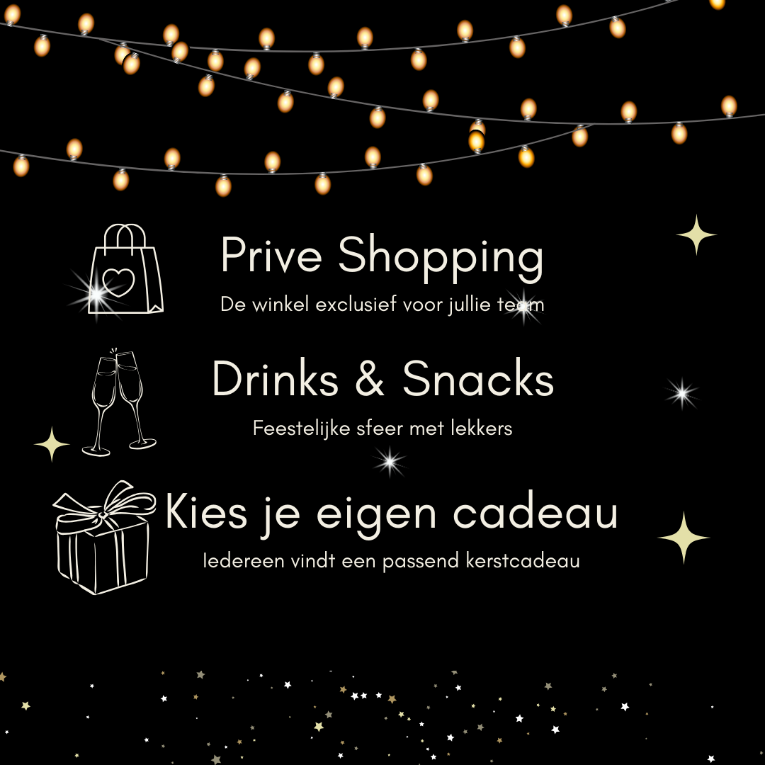 De winkel is exclusief voor jullie geopend: bubbels, lekkers en shoppen in luxe sfeer. Iedereen kiest zijn eigen cadeau.