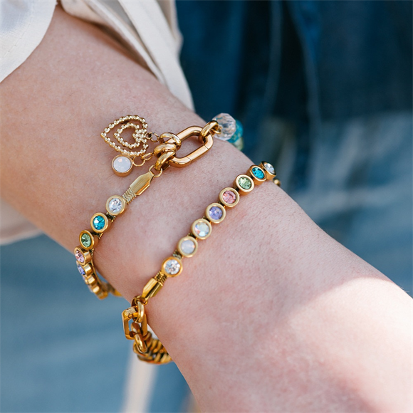 De iXXXi Connect Ketting Britta Blossom is een frisse en speelse aanvulling op jouw sieradencollectie. Deze ketting bestaat uit een fijne, platte schakel van stainless steel met goudkleurige plating, waaraan ronde vormen zijn bevestigd die zijn ingelegd met pastelkleurige steentjes. De zachte tinten zorgen voor een vrolijke, voorjaarslook die je direct in lentesferen brengt.
