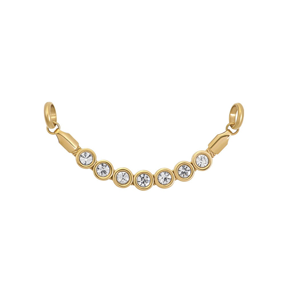 De iXXXi Connect Ketting Britta is een elegante toevoeging aan jouw persoonlijke sieraad. Deze ketting bestaat uit een fijne, platte schakel van stainless steel met goudkleurige plating, waaraan ronde vormen zijn bevestigd die zijn ingelegd met sprankelende zilverkleurige steentjes. Het verfijnde en feestelijke design geeft jouw look een chique uitstraling.