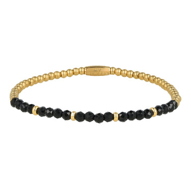Deze verfijnde armband is handgemaakt met facet geslepen Onyx edelsteen kralen en stijlvolle stainless steel kralen met 14k gouden plating. Dankzij het elastische design draag je hem moeiteloos en comfortabel, iedere dag opnieuw.