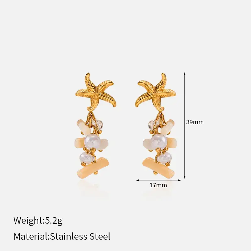 Stainless Steel Oorbellen met Zeester, Parels en Kralen – Goud