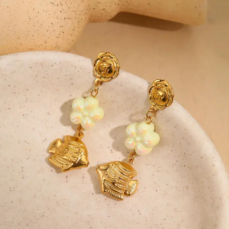 Speelse stainless steel oorbellen met vis bedel en parelmoer bloem. Lichtgewicht, kleurvast en perfect voor een zomerse look.