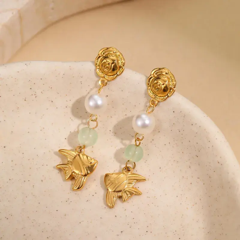 Stainless Steel Oorbellen met Vis Bedel, Parel en Groene Kraal – Goud