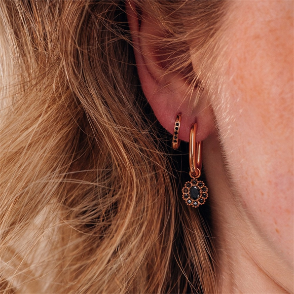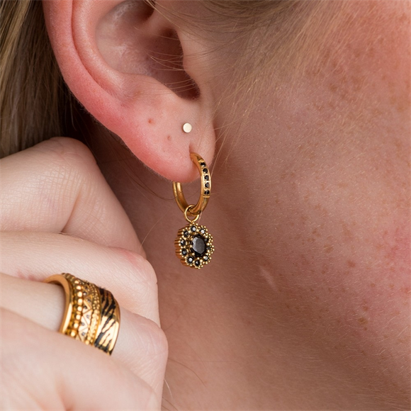 De iXXXi Hoop Charm Party is gemaakt van stainless steel en is voorzien van een goudkleurige plating. De charm bestaat uit een opvallende ovale, zwartkleurige zirconia in de vorm van een bloem. De Hoop Charm Party heeft een afmeting van 10mm en kun je perfect combineren met onze Hoops Party Black.
