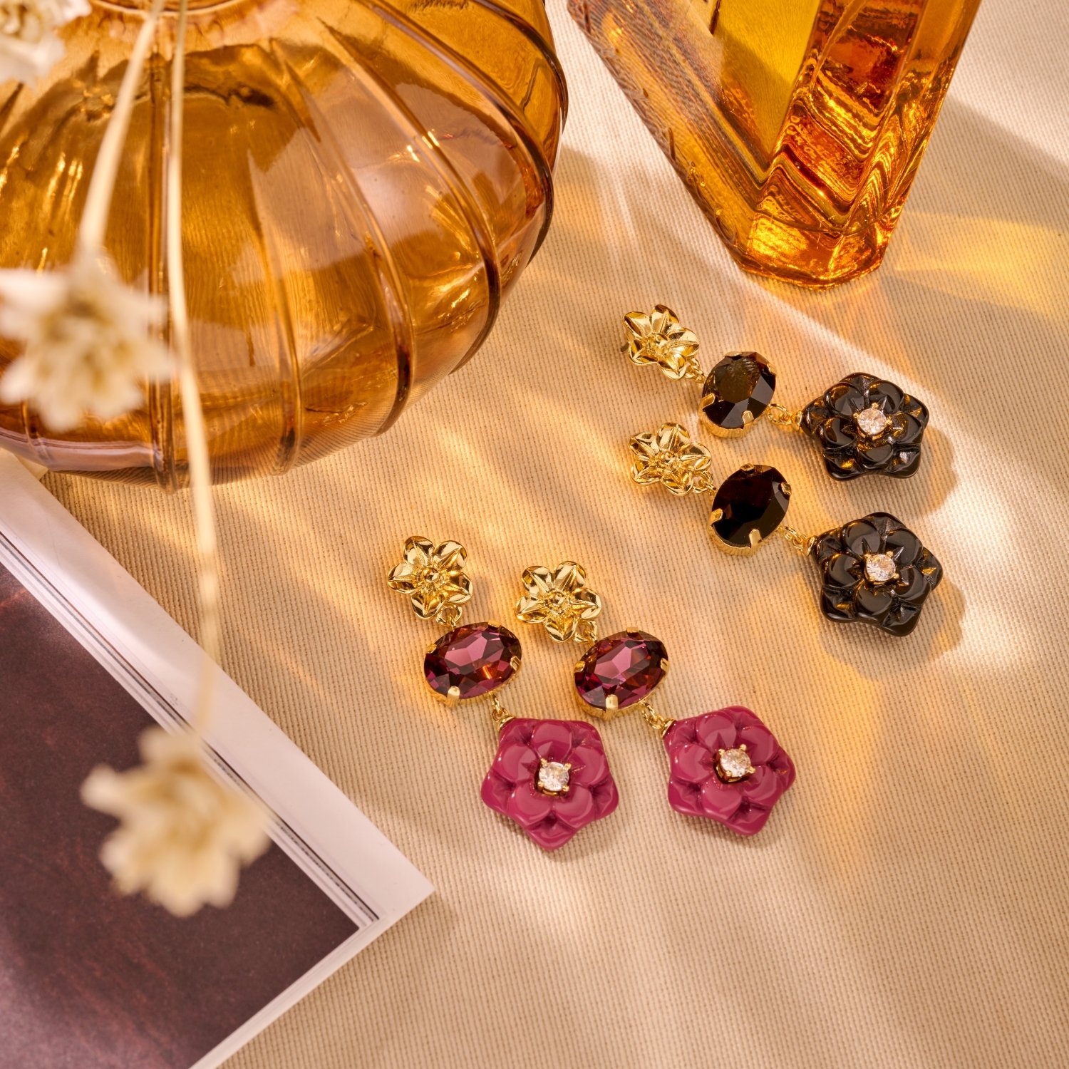 Vrouwelijke Biba oorbellen met gouden bloem, paarse steen en bloemhanger met kristal.