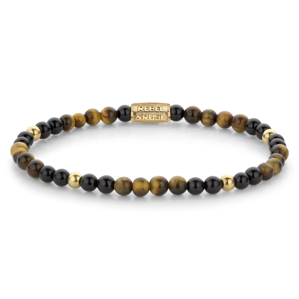 Bead armband, handgemaakt van 4mm Tijgeroog en Onyx stenen, en met 18 karaat goud ion-plated edelstalen stenen. De sluiting is gemaakt van 18 karaat goud ion-plated edelstaal. Het Rebel & Rose sieraad is makkelijk te combineren met andere kralenarmbanden.
