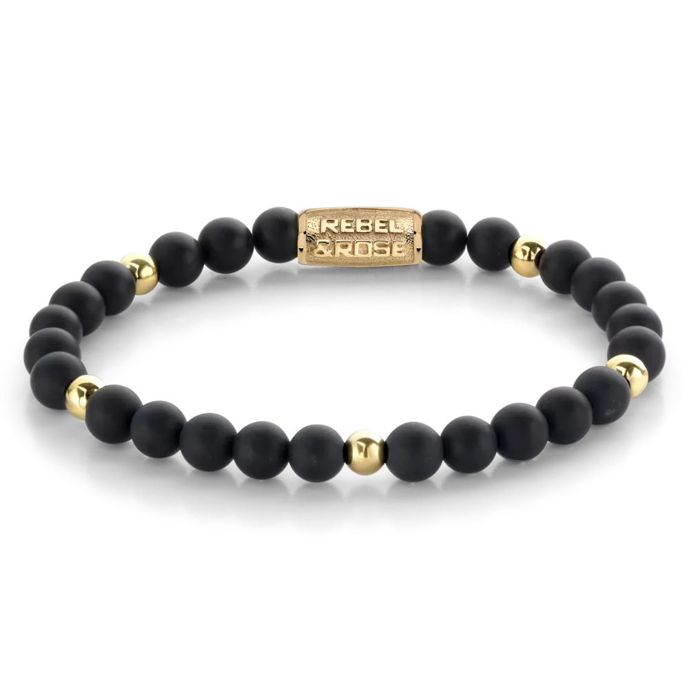 Bead armband, handgemaakt van 6mm stenen met een 18 karaat goud ion-plated edelstalen sluiting. Het Rebel & Rose sieraad is makkelijk te combineren met andere zilveren, leren of kralenarmbanden.