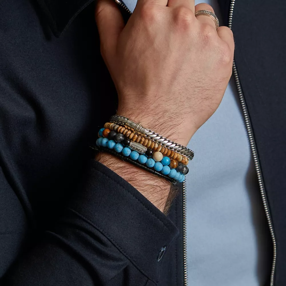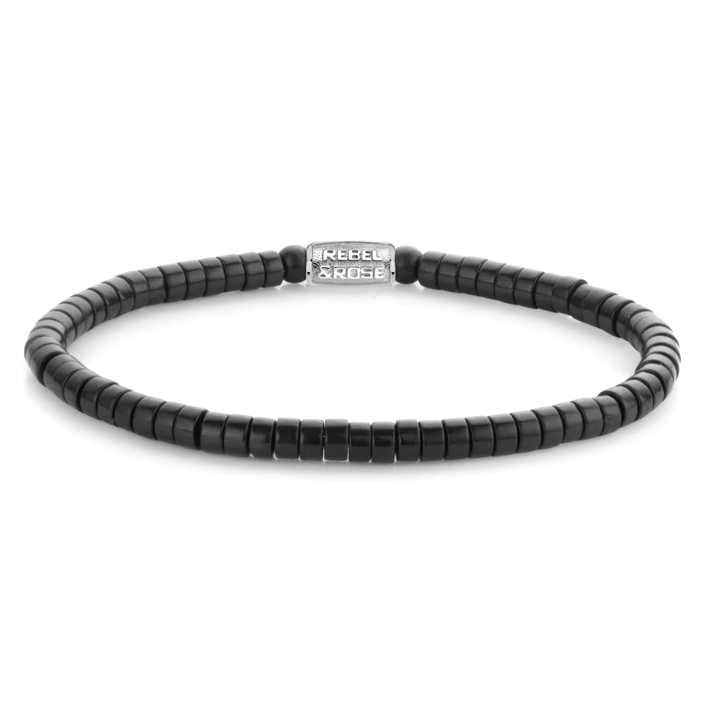 Bead armband, handgemaakt van 4mm Blackstone stenen in de vorm van slices / schijfjes. De sluiting is zilverkleurig. De slices armbanden laten zich heel makkelijk combineren met andere zilveren, leren of kralenarmbanden.