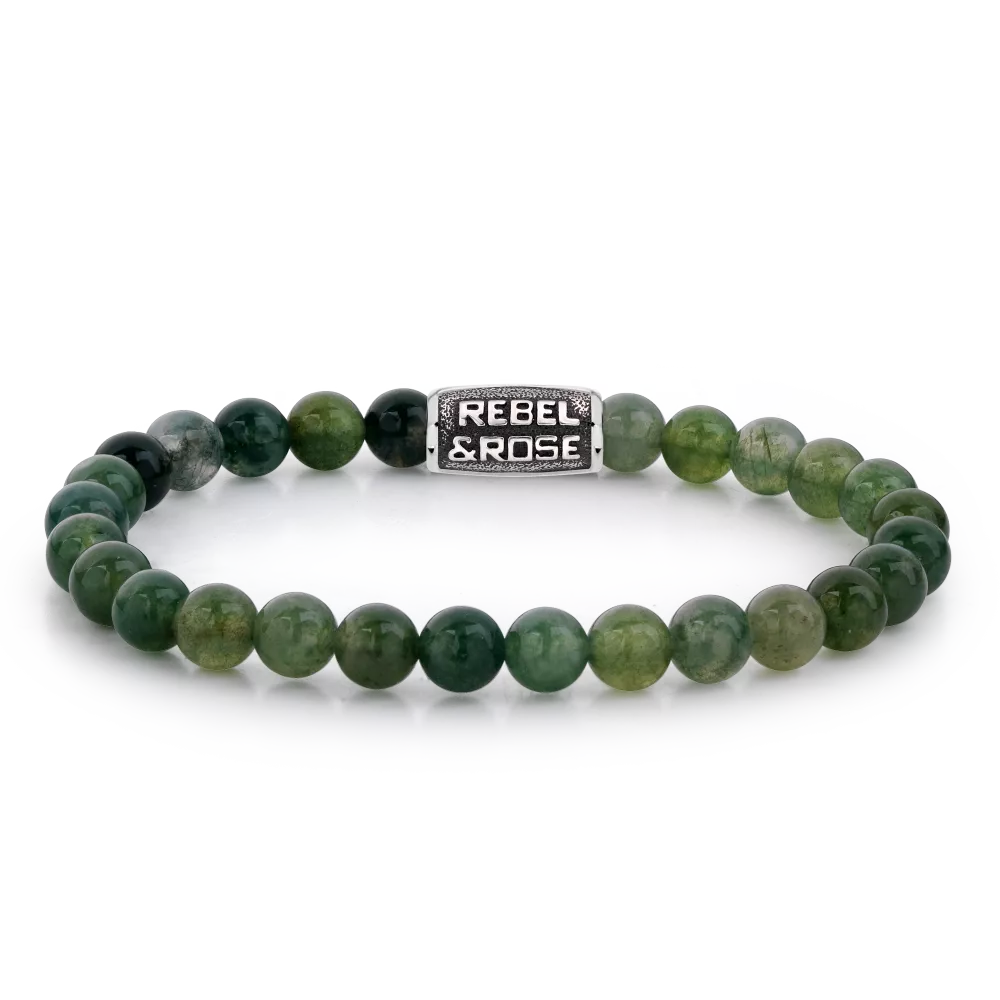 Bead armband, handgemaakt van 6mm Moss Agate stenen. De sluiting is van stainless steel en de vintage look is handmatig aangebracht. Het Rebel & Rose sieraad is makkelijk te combineren met andere zilveren, leren of kralenarmbanden.