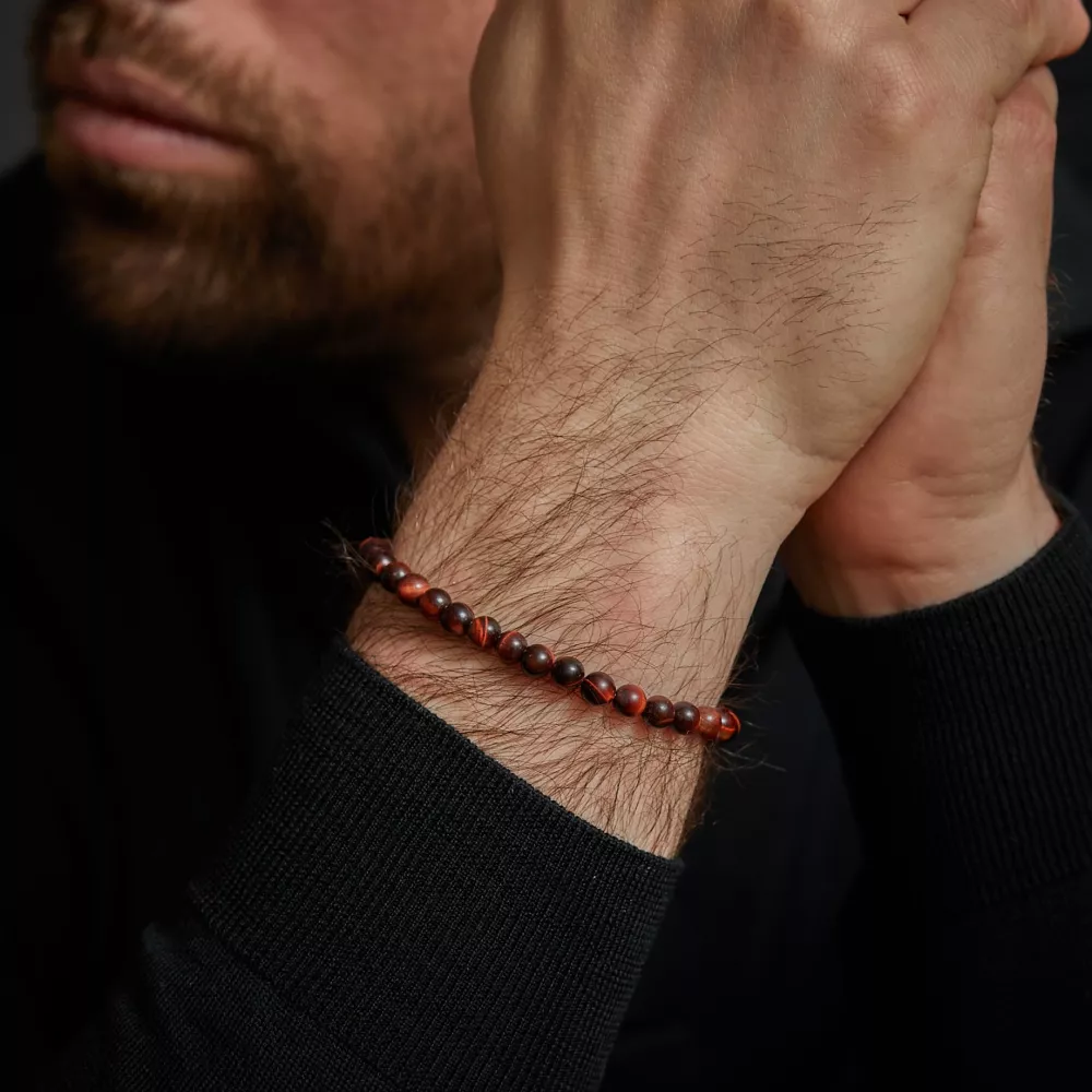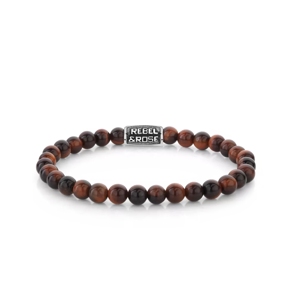 Bead armband, handgemaakt van 6mm Rode Tijgeroog stenen met een edelstalen sluiting. De Vintage look van de sluiting is met de hand aangebracht. Het Rebel & Rose sieraad is makkelijk te combineren met andere zilveren, leren of kralenarmbanden.