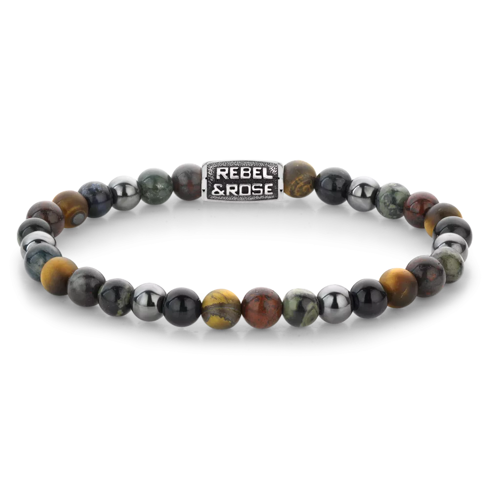 Bead armband, handgemaakt van 6 mm Tijgeroog Blauw, Tijgeroog Geel, Brecciated Jaspis, Ryoliet en Hematiet stenen met een stalen sluiting. De Vintage look van de sluiting is met de hand aangebracht. De sieraden van Rebel&Rose zijn makkelijk te combineren.