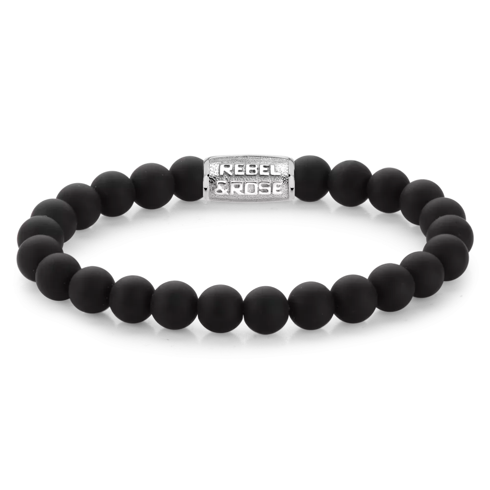 Bead armband, handgemaakt van 8mm mat zwarte Onyx stenen met een zilverkleurige sluiting. Het Rebel & Rose sieraad is makkelijk te combineren met andere zilveren, leren of kralenarmbanden.