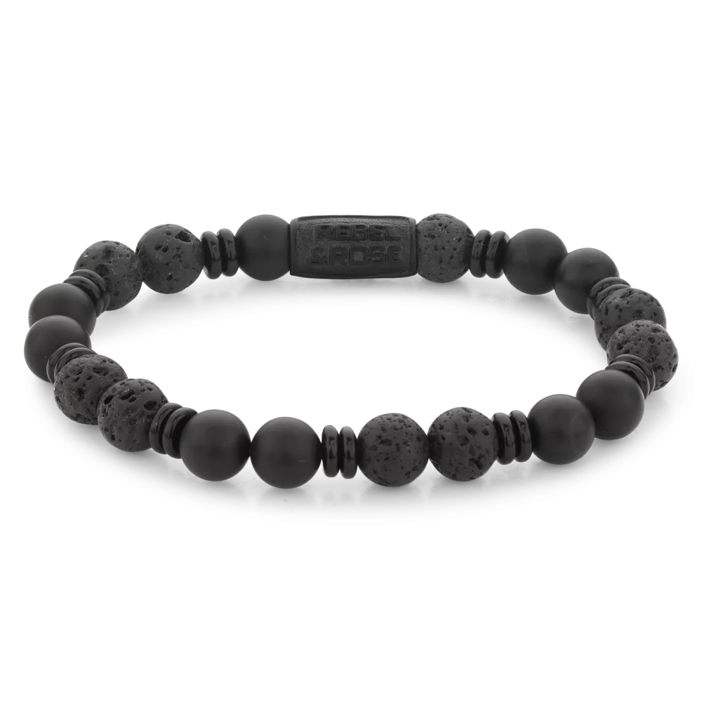 Bead armband, handgemaakt van 8mm Onyx natuurstenen kralen met eenedelstalen zwarte sluiting. Het Rebel & Rose sieraad is makkelijk te combineren met andere zilveren, leren of kralenarmbanden.