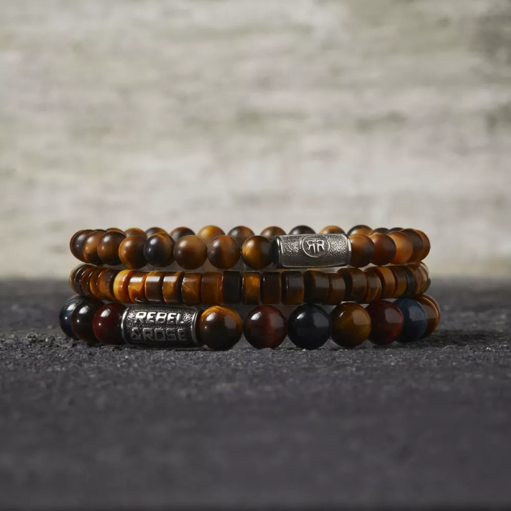 Bead armband, handgemaakt van 8mm gemixte Tijgeroog stenen. De sluiting is van stainless steel en de vintage look is handmatig aangebracht. Het Rebel & Rose sieraad is makkelijk te combineren met andere zilveren, leren of kralenarmbanden.