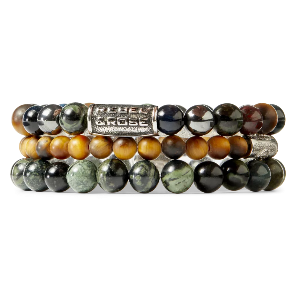 Bead armband, handgemaakt van 8 mm Tijgeroog Blauw, Tijgeroog Geel, Brecciated Jaspis, Ryoliet en Hematiet stenen met een edelstalen sluiting. De Vintage look van de sluiting is met de hand aangebracht.