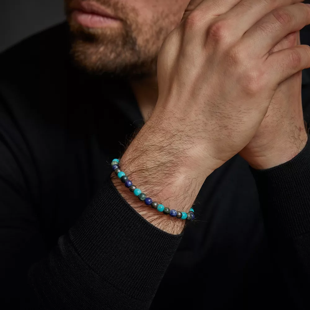 Bead armband, handgemaakt van 6mm Ryoliet, Sodaliet, Hematiet en Turquoise stenen met een zilverkleurig slot. Het Rebel & Rose sieraad is makkelijk te combineren met andere zilveren, leren of kralenarmbanden.