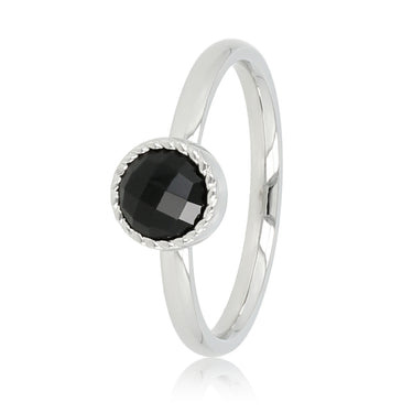Goud- of zilverkleurige ring met zwarte glassteen en twisted randje. Perfect voor je ringenset. 1 jaar garantie.