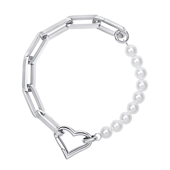 Stainless steel schakelarmband met pareltjes en een groot open hart.