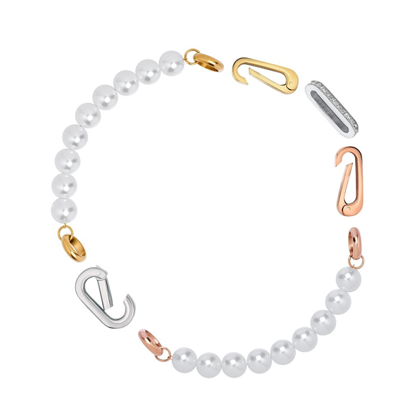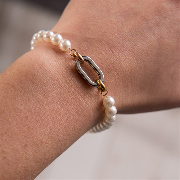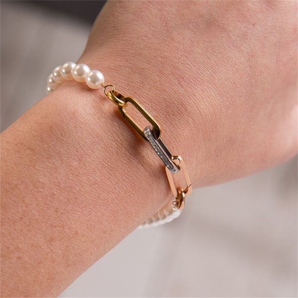 Stainless steel grove schakelarmband van iXXXi Connect met pareltjes en een gedecoreerde link.