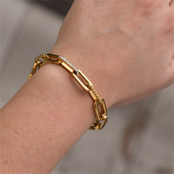 De Connect armband Charlotte bestaat uit verschillende sieraad onderdelen uit de iXXXi Connect collectie, gemaakt van stainless steel. Met onze iXXXi Connect schakels, kettingen en verbindschakels kun je geheel naar wens je eigen sieraad samenstellen. De Connect armband Charlotte is samengesteld uit de sieraad onderdelen: de ketting Connect in de kleur goud, twee keer Click Connect, één Click Oval en één Click Heart, allemaal in de kleur goud en één Link Balls, Zirconia en Twisted in de kleur goud. Link your style, connect your story.