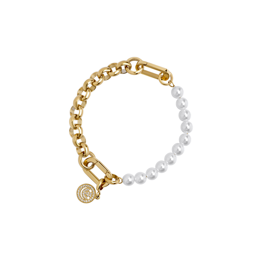 Samengestelde stainless steel grovere schakelarmband met parels en een smiley bedel.