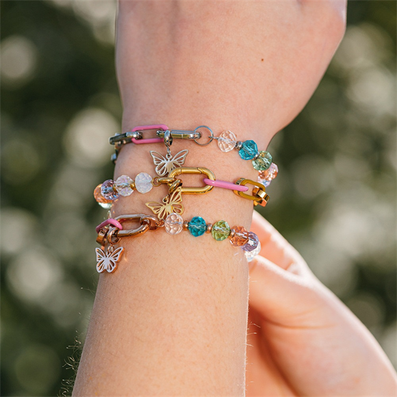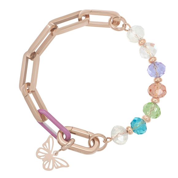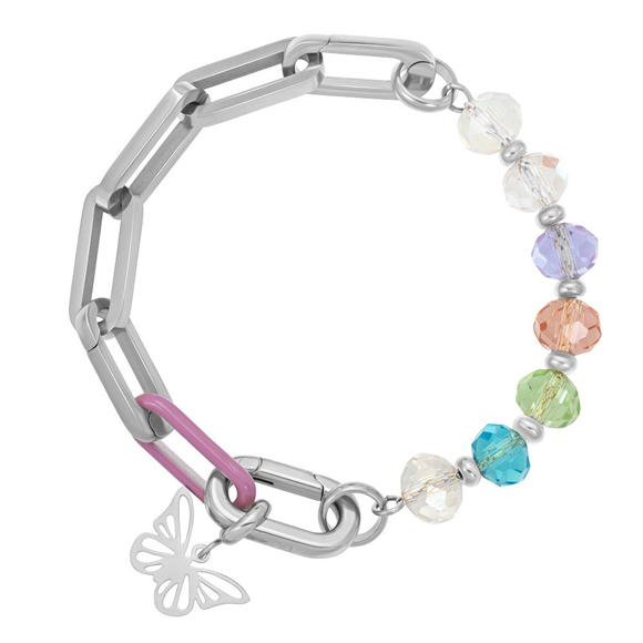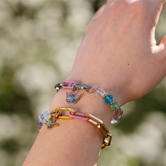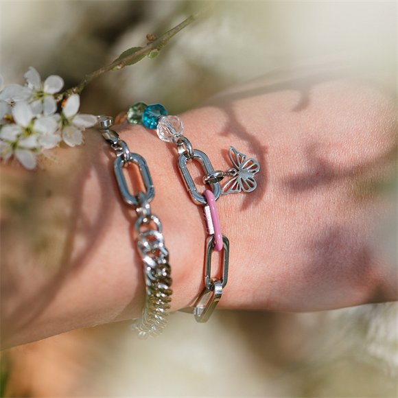 De Connect armband Gwen bestaat uit verschillende sieraad onderdelen uit de iXXXi Connect collectie, gemaakt van stainless steel. Met onze iXXXi Connect schakels, kettingen en verbindschakels kun je geheel naar wens je eigen sieraad samenstellen. De Connect armband Gwen is samengesteld uit de sieraad onderdelen: de ketting Connect (7.2 cm), de ketting Bliss Blossom (7.5 cm), Schakel Pink, Verbindschakel Oval, Verbindschakel Connect en de Bedel Butterfly. Link your style, connect your story.
