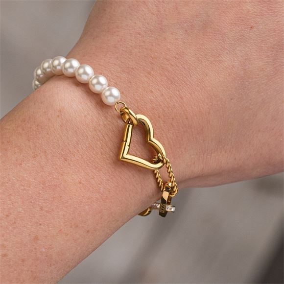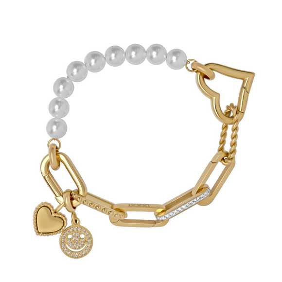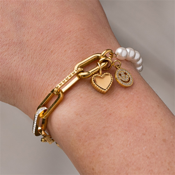 Stainless steel grove schakelarmband van iXXXi Connect met pareltjes en een smiley & hartje bedel.