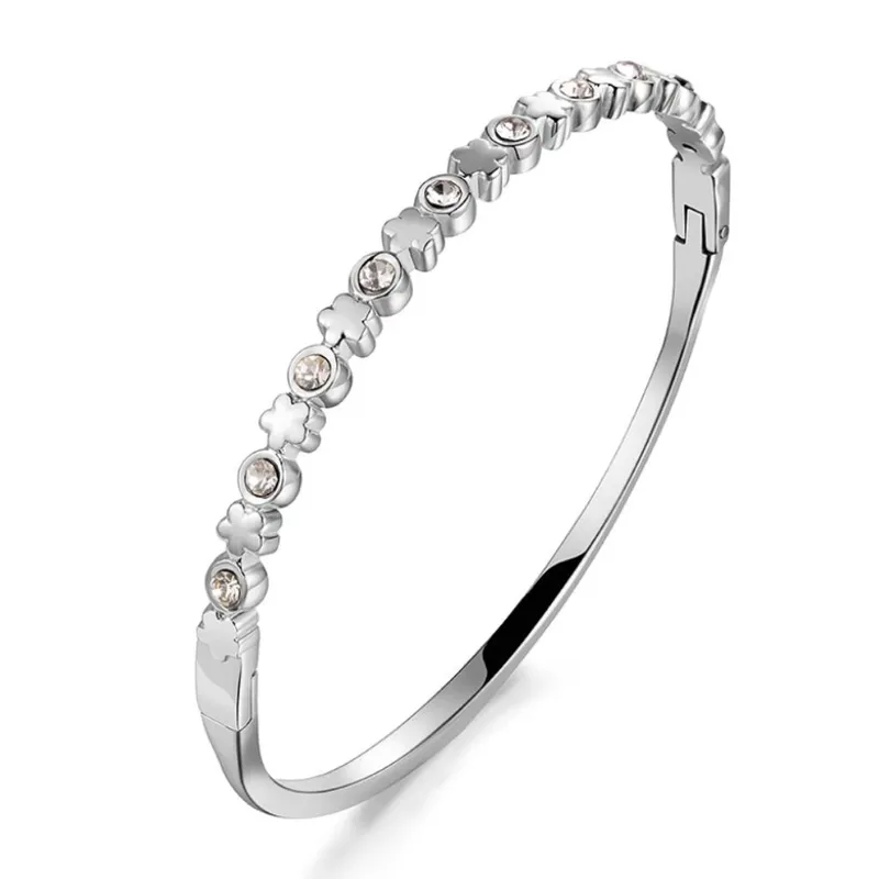 Stainless Steel Bangle met Klaver Bloemen en Zirkonia – Zilverkleurige Armband