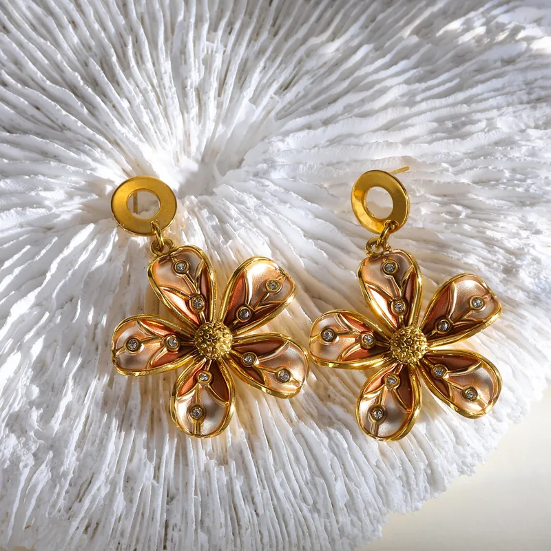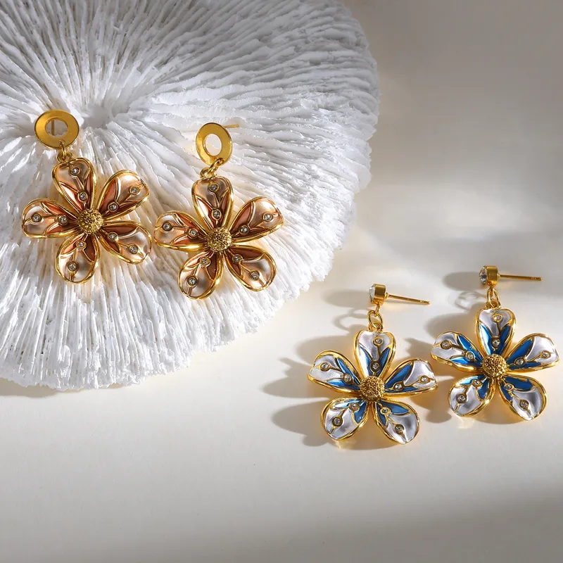 Deze stainless steel bloem oorbellen zijn alles wat je zoekt als je houdt van opvallende, trendy sieraden met een luxe uitstraling. De verfijnde bloemvorm, gecombineerd met subtiele zirkonia steentjes en gekleurde accenten in blauw of warm bruin, maakt deze oorbellen een echte musthave van dit moment.