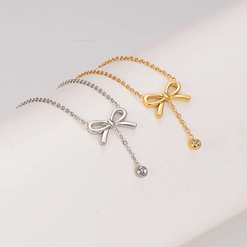 Deze verfijnde ketting met strikje is een echte eyecatcher voor liefhebbers van elegante, vrouwelijke sieraden. Het subtiele strikdesign gecombineerd met een klein hangend steentje geeft een speelse, maar luxe uitstraling.