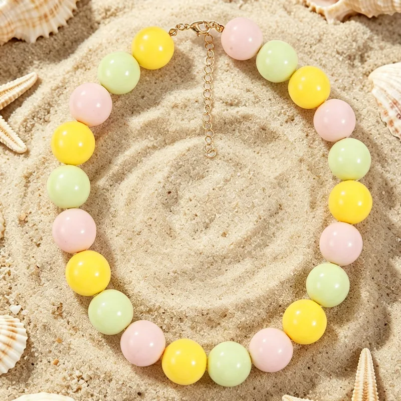 Deze vrolijke kralenketting is een echte musthave voor de zomer. De combinatie van zachtgeel, mintgroen en lichtroze zorgt voor een frisse en speelse uitstraling die je outfit direct opfleurt.