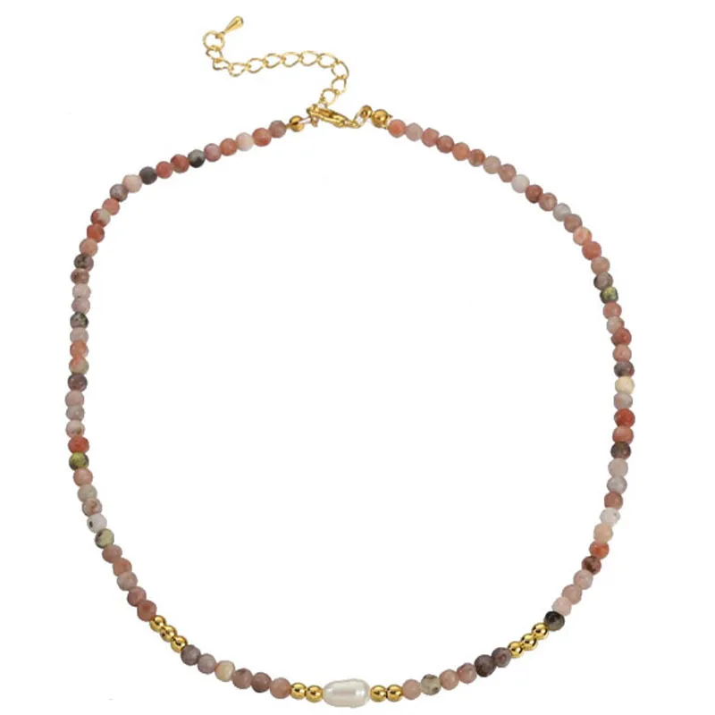 Natuursteen ketting met zachte gemêleerde tinten en parel. Elegant, tijdloos en makkelijk te combineren.