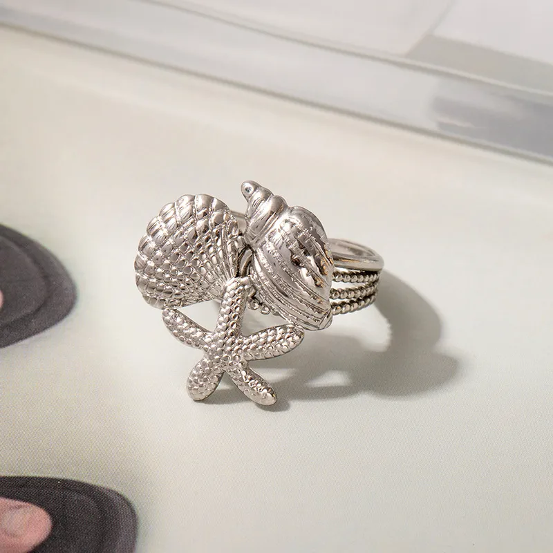 Verstelbare statement ring met schelp en zeester design. Gemaakt van stainless steel en verkrijgbaar in goud- of zilverkleurig.