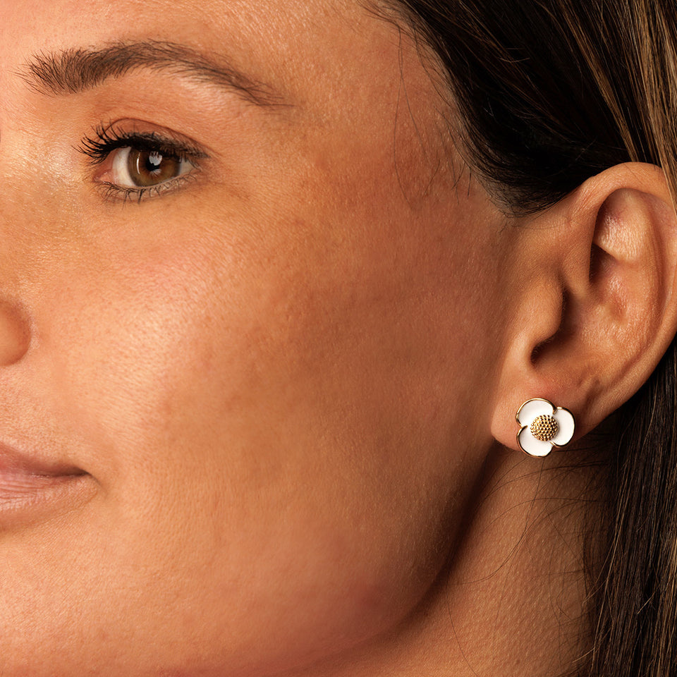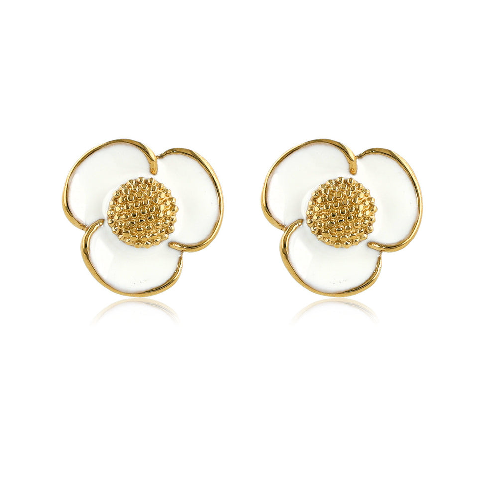 Stralende Gouden Oorsteker met Witte Epoxy Bloemendetail