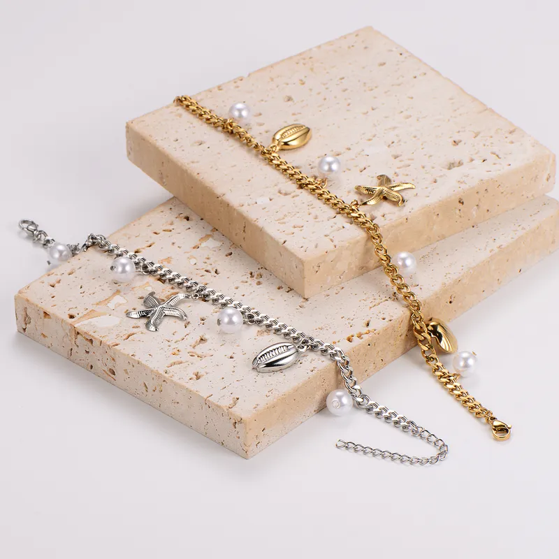 Zomerse armband met zeester, schelp en parels. Verkrijgbaar in goud en zilver.