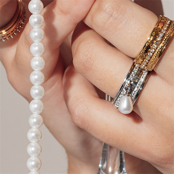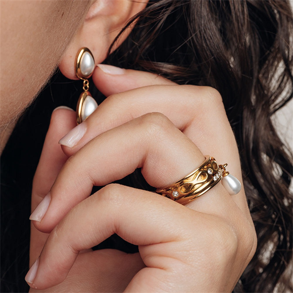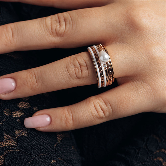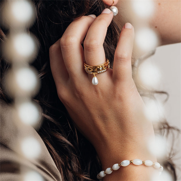 Aan beide kanten van de ring zijn vijf kleine zirconia steentjes ingelegd die subtiel schitteren bij elke beweging. In het midden hangt een klein pareltje, wat de ring een charmante en vrouwelijke uitstraling geeft.